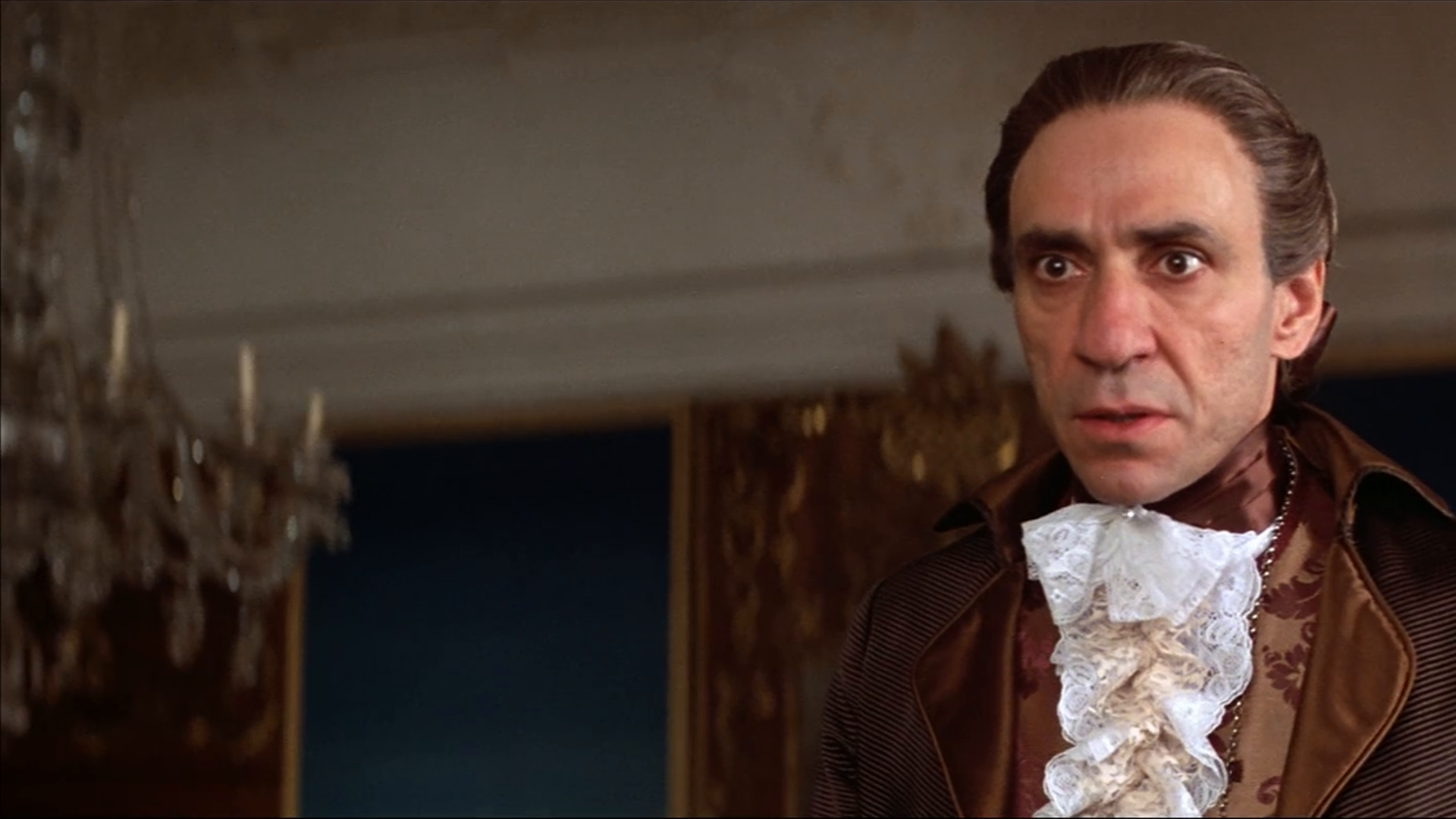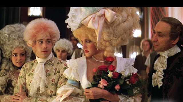 아마도 그의 위치에 대한 그의 확신은 Forman이 모차르트를 약간 시대에 뒤떨어지게 만들 자유를 주었을 것입니다. Forman은 " 헤어 "의 영화 버전을 감독 했으며 이 영화에서 모차르트는 "헤어"의 일부 캐릭터와 정신을 공유하는 것 같습니다. 모차르트의 가발은 다른 사람의 가발처럼 보이지 않습니다. 그들은 펑크의 가장 작은 암시, 핑크의 가장 작은 음영을 가지고 있습니다. 모차르트는 다른 어느 시대보다도 1960년대의 아이처럼 보이며, 그의 성격에 대한 이러한 해석(그는 자신의 느낌을 신뢰하는 불경한 원시 히피였습니다)이 위험하게 들리지만 효과가 있습니다.